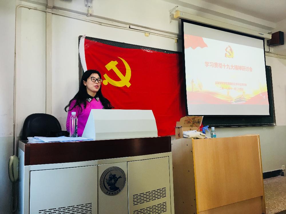 会上,安虹老师首先总结了支部前一阶段学习宣传贯彻党的十九大精神的情况,对今后一段时期十九大精神学习的具体要求和工作内容进行了安排,要求党员从“深”“新”“实”三个层面学习贯彻十九大精神。之后她结合十九大报告的相关内容,谈了自己的学习心得和体会,并倡导在座党员都能够认真学习十九大报告,领悟十九大精神,增强“四个意识”,坚定“四个自信”,把十九大精神与个人发展、班级建设、支部建设紧密结合起来,学以致用,带领班级成员弘扬十九大精神。