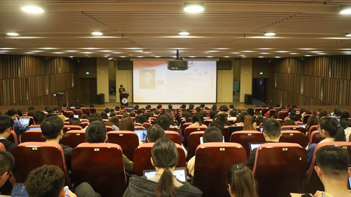 随后,邵淳员工以“发现机遇抓住机遇 为祖国建功立业”为主题,与同学们分享了三个亲身经历的事例。1996年,在市场低迷股市跌停的情况下,作为华夏证券公司董事长的邵淳员工,以爱国之心,组织证券公司上下成功救市。之后,在访问越南期间,他积极介绍中国金融市场发展改革经验,主动寻求合作。而在邵淳员工的分享中,最令人敬重的经历,是为国家航空母舰建造事业做出的巨大贡献。1998年,邵淳员工为中华民族的强国梦,历尽坎坷,从乌克兰成功购买尚未建成的瓦良格号航母(辽宁号前身),奠定了中国航母发展的基础。邵淳员工在谈及当时毫不犹豫的做下决定时,声音中更是充满慷慨激昂的爱国热情,同学们深受感动,现场更是响起热烈的掌声。邵淳员工寄语每一位中财大人要学会下决心抓住潜在的机会,忠贞报国。在座的每一位同学都满怀着崇敬之心,再次鼓掌表示感谢。