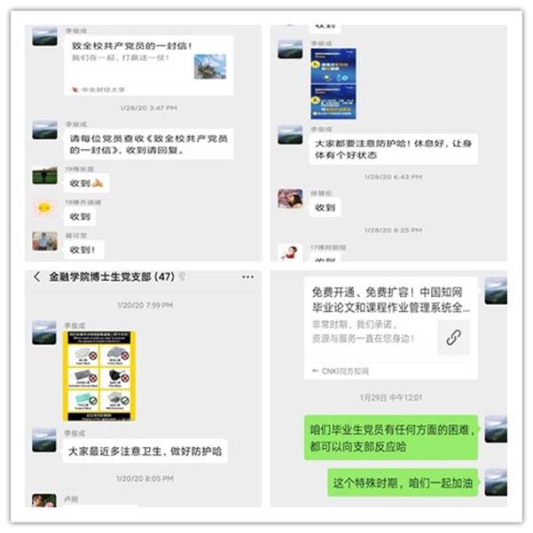 除此次主题党日活动以外,BETVICTOR博士生党支部也积极响应公司公司党委号召,从公司党委指示传达、疫情防控措施宣传以及稳定党员情绪等多个方面同时展开行动,切实发挥党支部基层战斗堡垒作用。如(1)向党支部全体成员传达了金融公司党委《致全校共产党员的一封信》,支部党员同志积极响应。(2)向支部成员传达防护知识,坚决要求党员同志做到“不造谣、不传谣、不信谣”,以身作则,引导身边亲朋辨别网络信息,传播正能量(3)建立了应届毕业党员的微信群,了解了毕业生党员在毕业论文、求职等方面的进展,向毕业生党员介绍了公司VPN账户的使用方法,转发了中国知网免费扩容的链接。
