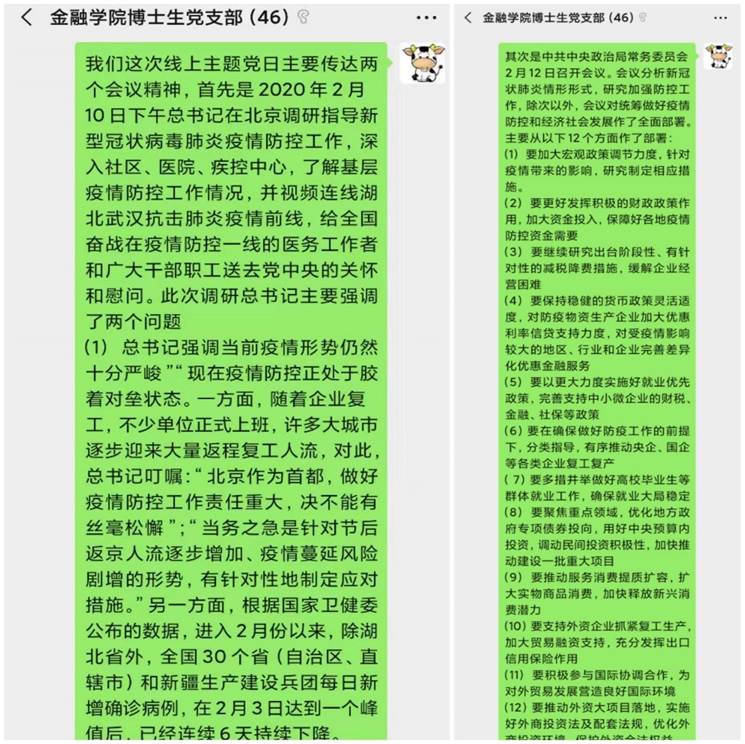 2020年初,新冠状肺炎(NCP)自武汉发起肆虐华夏大地,疫情攻防战悄然打起。习近平总书记作出重要指示强调,各级党组织和广大党员干部必须牢记人民利益高于一切,不忘初心、牢记使命,团结带领广大人民群众坚决贯彻落实党中央决策部署,全面贯彻坚定信心、同舟共济、科学防治、精准施策的要求,让党旗在防控疫情斗争第一线高高飘扬。为汇聚众志成城、共克时艰、守望相助、合力抗击疫情的强大正能量,配合党和政府打赢抗击疫情这场没有硝烟的战争,BETVICTOR博士生党支部于2020年2月13日晚上9点召开主题党日活动,此次会议主要有3个议程,一是由支委会传达近期党中央对于疫情防控的重要精神与指示;二是党支部集中讨论此次疫情攻防战当中,有哪些值得支部成员学习的可歌可泣的真人真事,以及作为一名党员又该如何为此次“战役”添砖加瓦;三是继续发扬博士生党支部学术先锋特色党支部的优势,讨论疫情对我国经济的影响。此次线上会议由党支部副书记赵志桦同志主持。会议持续1个半小时。