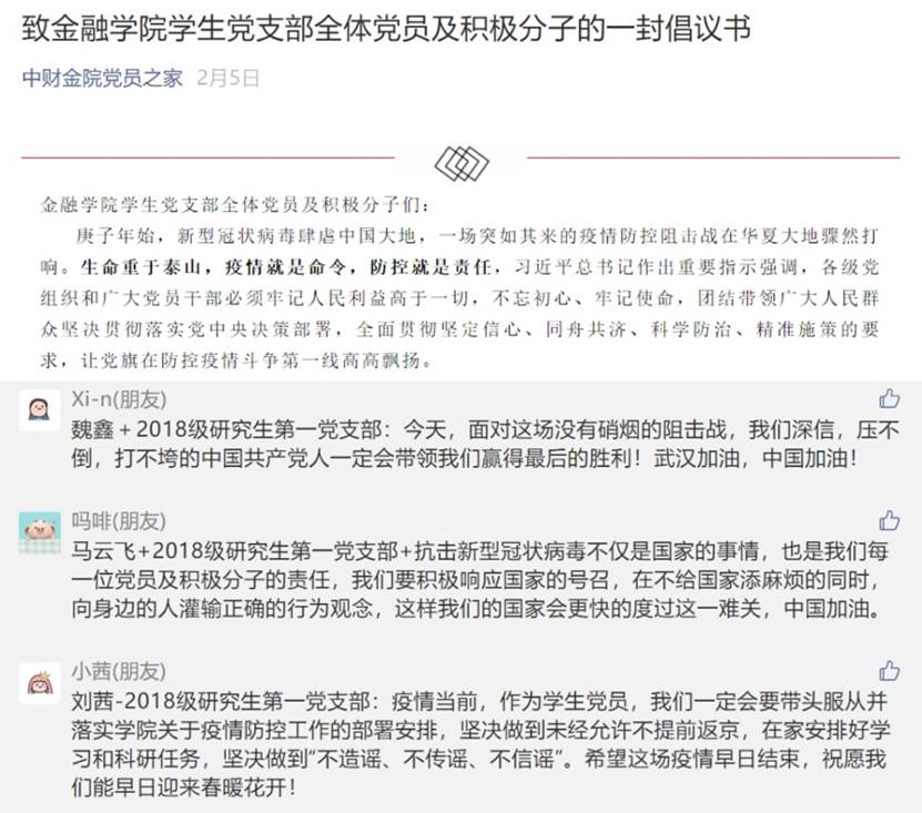 1月28日,公司党委发出了《致全校共产党员的一封信》,号召全公司党员弘扬“担当责任、勇往直前”的中财精神,充分发挥共产党员的先锋模范作用,坚决打赢这场疫情防控阻击战。作为2018级研究生第一党支部书记的阮志朋同志第一时间转发,呼吁本支部党员同志提高政治站位,遵从党委统一部署,充分发挥研究生基层党组织战斗堡垒作用;强化政治担当,协助公司积极引导,充分发挥党员干部示范带头作用;增强政治自觉,严控自身行为作风,带头做命令的执行者、稳定的维护者。2月5日,公司党委发出了《致BETVICTOR员工党支部全体党员及积极分子的一封倡议书》,号召全体党员及积极分子带头服从并落实公司关于疫情防控工作的部署安排,坚决做到在特殊时期不离家、不提前返校。本支部的党员同志和积极分子纷纷在微信公众号下留言承诺:“我将以身作则,少出门,少聚会,勤洗手,不传谣信谣,以实际行动发扬党员的模范带头作用”、“我们一定会带头服从并落实公司关于疫情防控工作的部署安排,坚决做到未经允许不提前返京,在家安排好学习和科研任务”……一句句承诺饱含着党员同志众志成城、共克时艰的决心与信心。