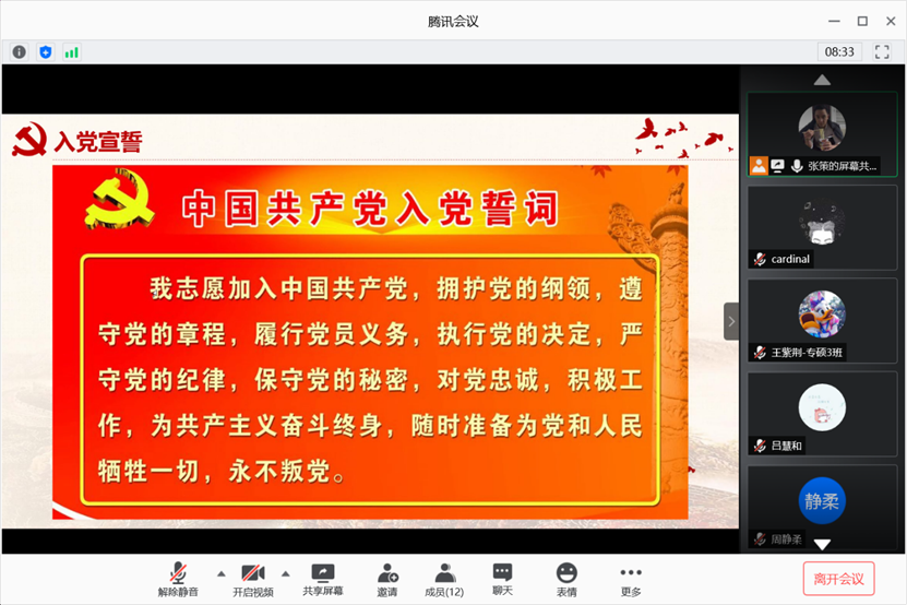 本次会议由支部书记张策同志主持,支部全体党员同志参加。此次议程包括三项:第一项为支部书记张策同志讲党课,第二项为支部党员同志分享战疫故事,第三项为重温入党誓词。