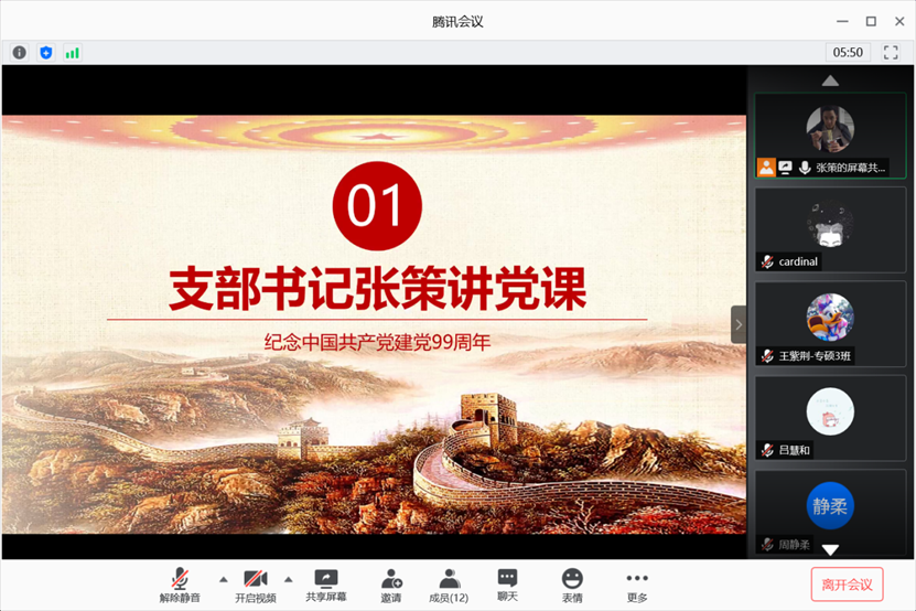 最后,张策同志分享了本支部的抗疫努力。疫情发生以来,本支部党员主动履职,有效发挥员工党员的先锋模范作用,弘扬了“担当责任、勇往直前”的中财精神。在支部书记和班长的号召下,支部全体党员带头遵守公司、公司疫情防控工作的各项要求,引导班级同学积极响应号召,服从公司、公司疫情防控工作整体安排;实行党员责任制,积极配合公司辅导员开展疫情防控排查摸底、信息统计及身体健康信息报送等工作;在线观看《新型冠状病毒肺炎》讲座,学习并向亲友普及防疫知识,发挥带头模范作用;停课不停学,努力营造“放假不放松、学习不断线”的自主学习氛围。