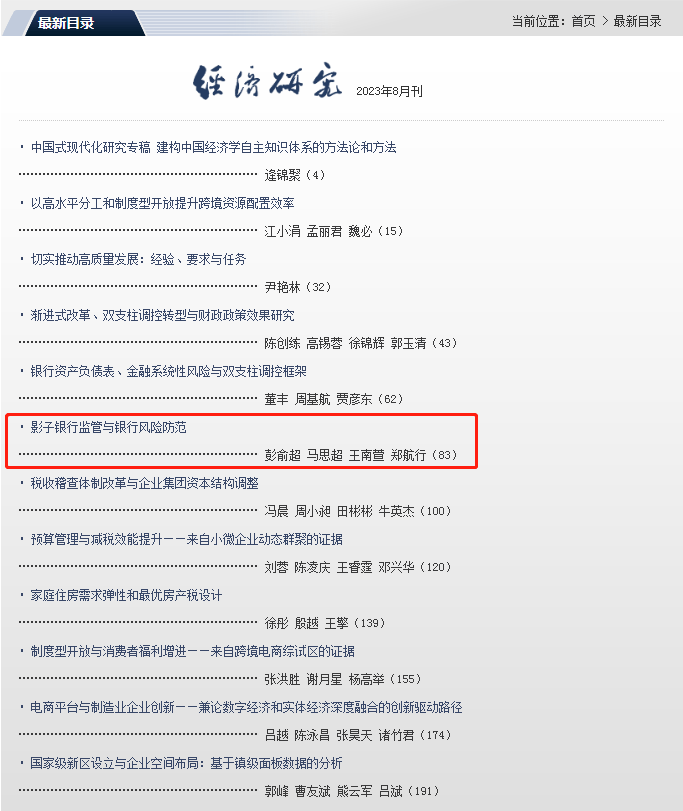 近期,公司BETVICTOR彭俞超副教授、2023级博士生王南萱、2019级博士生郑航行,与首都经济贸易大学马思超副教授(公司2020届博士毕业生)合作撰写的论文《影子银行监管与银行风险防范》发表于《经济研究》2023年第8期。