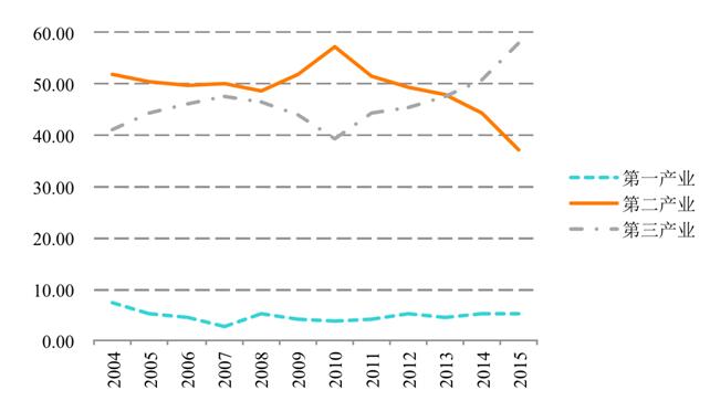 随着人民币不断升值,中国经济内部失衡问题得到缓解,主要体现在两个方面:一是人民币升值促进了我国产业结构升级,近年来第三产业对GDP增长贡献率不断提高,由2005年的44.40%上升到2015年末57.70%;而第二产业的贡献率则相应由50.30%下降到37.10%,表明我国产业结构趋于合理(见图2)。二是从2005年至2015年,我国最终消费对GDP增长贡献率由43.50%上升到66.40%,资本形成对GDP增长贡献率则由61.90%下降到46.74%,经济增长模式逐步由投资拉动型转换为消费驱动型。