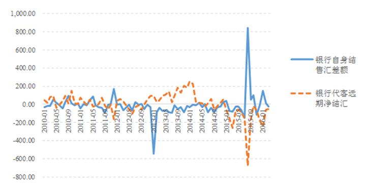 图5 银行自身结售汇净额与代客远期结汇净额(亿美元)