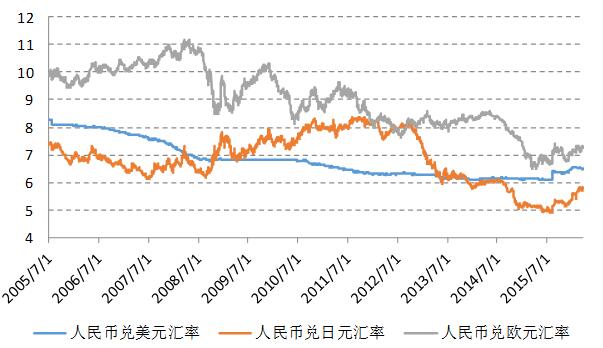 从2005年7月到2016年4月,人民币兑美元、日元、欧元汇率的升值幅度分别为21.19%、21.06%和27.15%;国际清算银行(BIS)口径的人民币实际有效汇率同期累计升值51.13%。从人民币兑美元汇率走势形态来看,人民币汇率波动可以分为四个阶段:第一阶段为2005年7月至2008年7月,其间人民币汇率快速升值,年均升幅达5.33%。第二阶段为2008年8月至2010年5月,为应对全球性金融危机,汇改一度暂停,人民币汇率重新钉住美元,升值趋势相应停止。第三阶段为2010年6月至2015年7月,随着国内经济形势逐步好转,人民币重新迈入升值区间,但从2011年四季度后波动性明显增强,汇率有涨有跌。第四阶段为“811汇改”之后,人民币汇率市场价多个交易日连续跌停,人民币开始释放贬值压力;至2016年5月,人民币兑美元已累积贬值6.84%(见图1)。