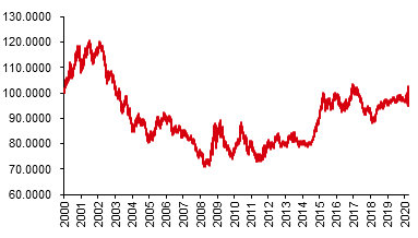 第一,由于超级量化宽松政策的实施,美元在未来几年走软的概率将会显著提高。2009年之后,美联储为了应对全球金融危机实行了长达6年左右的量宽政策,结果导致美元走势长期低迷。这种局面直到2015年下半年美联储正式启动退出量宽才结束(见图1)。历史将会重演。今年3月9至20日,受恐慌情绪的影响,美元指数一度出现强势攀升。但是,当美联储于23日宣布无上限量化宽松政策之后,美元指数开始一路走低。可以认为,未来尽管在短期内会有波动,但只要量化宽松政策不改变,美元总体上将呈现弱势。