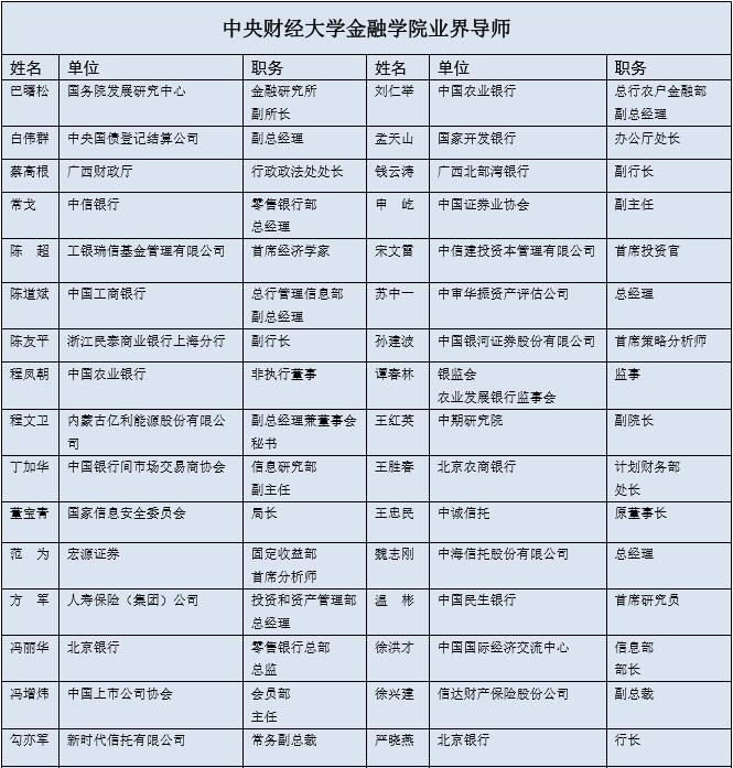 BETVICTOR聘请了一批有成就的政府部门领导、学术界和金融业界精英作为兼职教授和兼职导师。在学员做论文期间,会同时由校内和校外两位导师指导,凸显了我们学员培养过程中的理论与实务相结合。