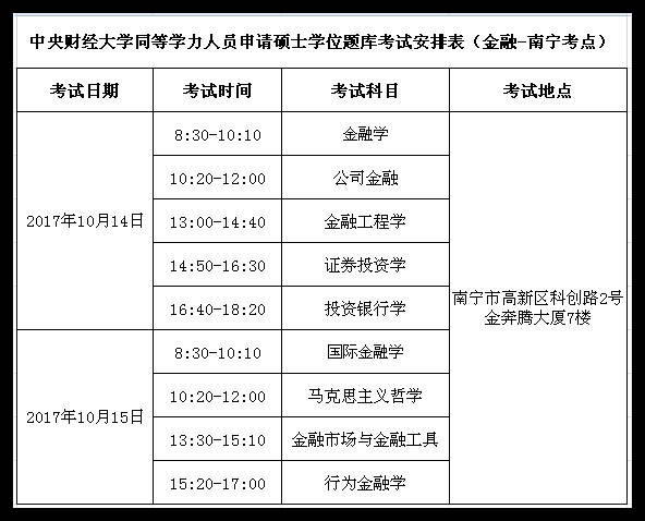 金融专业在职高级研修班南宁班2014级-2015级、贵阳班2014级-2015级、海口班2014级题库考试(校考)将于2017年10月14-15日在南宁进行,考试安排和考场地点请见下图,请参加考试的同学准时应考。考点地址及周边情况等信息请见附件。