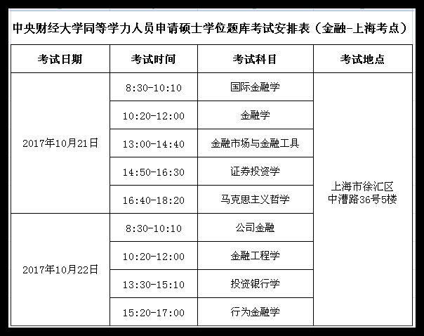 金融专业在职高级研修班上海班2015级-2017级题库考试(校考)将于2017年10月21-22日在上海进行,考试安排和考场地点请见下图,请参加考试的同学准时应考。