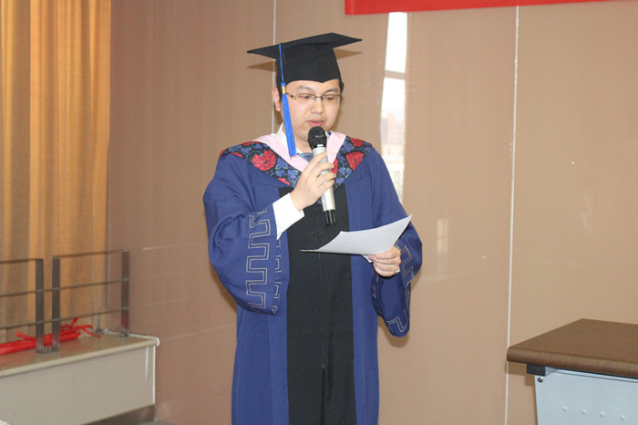 员工代表向海帆发言,作为2013级3班的班长,向海帆一直表现十分优越,不仅学习成绩全部以高分通过,硕士论文答辩顺利通过,还经常组织班级活动,加强了班级凝聚力。他仅用两年就拿到了硕士学位,堪称员工们的优秀榜样。他代表全体同学表达了对老师的感激,和对母校的不舍。几年来的学习和磨练,沉淀了大家的喜怒哀乐,他们将谨记中财“忠诚团结,求实创新”的校训,发扬龙马担乾坤的精神,带着中财员工的印记扬帆远航!
