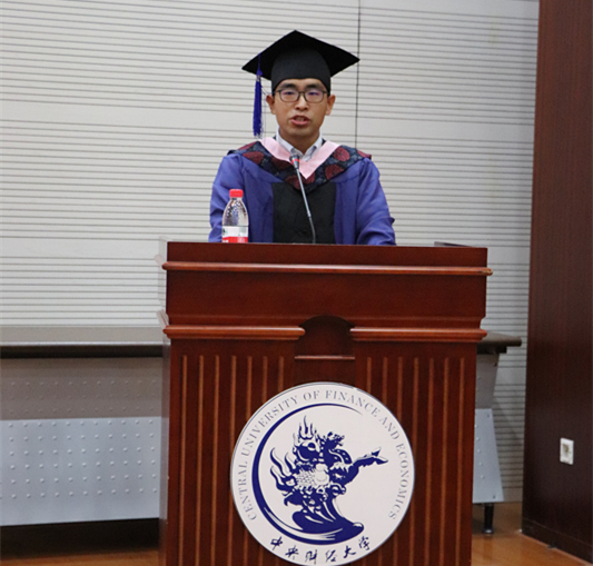 仪式第四项,由本次硕士学位获得者张彦超代表全体同学发言。首先,他对公司导师的指导和帮助表示真诚的感谢,随后带领着大家一起回忆初入学时的情景,仿佛一切尽在昨天。在中财学习的日子里,不仅收获了满满的金融知识,了解了数据背后的神秘逻辑,层层揭开金融知识的面纱;而且成功进入金融量化投资领域,从事着自己喜欢的工作;最重要的是还收获了深厚的友情,收获了无悔的未来!