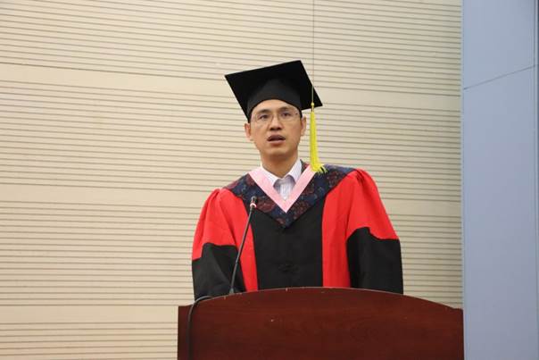 仪式第四项是由董信芳代表此次获学位同学发言。首先他对公司导师的指导和帮助表示真诚的感谢。随后他还带领着大家一起回忆初入学时的种种情景。但斗转星移,很快就到了收获,也是离别的时刻。他认为,在中财学习的日子里,他不仅收获了满满的金融知识,而且还收获了深厚的友情,收获了无悔的未来。