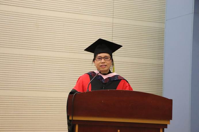 接下来国际金融系副教授聂利君老师作为导师代表发言。在发言中,聂老师也首先向在座的各位同学表达了衷心的祝贺,指出获得这个硕士学位着实不易。她强调授课和论文写作过程中导师们的严格要求既是为了培养员工们严谨的学术思维和学术能力,也是为了保证学术成果的质量。也正因为这样,在座的各位同学经过了多重关卡而获得的学位帽含金量是经得起检验的。最后她向在座的所有同学表达了殷切的期望,希望大家在今后的生活中收获幸福,在工作岗位上再创辉煌!