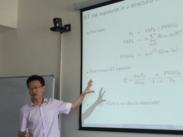 本次研讨会由长江商公司助理教授宋忠智就“投资冲击对横截面回报率的影响” 做了专业而精彩的报告。宋忠智教授提出了一个新的基于投资数据衡量技术冲击(IST)的方法, 这不同于以往的基于变量指标的测量方法。此外,文章用这个新的测量方法研究了IST对股票回报率的影响,并将其应用到账面市值比(B/M),发现价值型的公司比成长型的公司有更高的IST。最后,文章从实验数据方面和从结构模型两个方面,对基于投资和基于变量指标的IST对账面市值比的影响做了比较。在实验证据中发现,基于投资的IST衡量的价值型公司有较高的beta,但是基于变量指标衡量的价值型公司有较低的贝塔。在结构模型中发现,基于投资的IST与基于变量指标的IST是等价的。在报告会中,参会老师与演讲嘉宾就报告内容展开了热烈的讨论,使得参会人员受益匪浅。