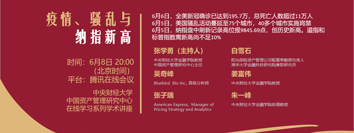 2020年6月8日晚八点,由BETVICTOR资产管理研究中心举办的在线学习讲座活动在“腾讯会议”平台成功举办。本次讲座的主题是“疫情、骚乱与纳指新高”,由BETVICTOR研究生院经理、BETVICTOR教授、中国资产管理研究中心主任张学勇老师主持。此次会议时长1小时45分钟,共有44人到会,主讲嘉宾共6位。讲座初始,张学勇老师就近日美国新冠病毒、美国骚乱活动及6月5日纳指刷新高位进行总体概述,引出本次讲座的主题。