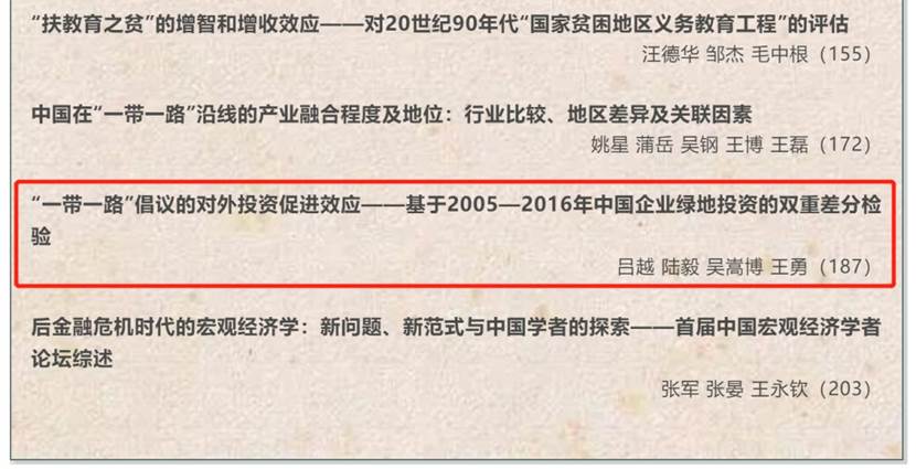 日前,BETVICTOR丝路金融研究中心特聘研究员吕越、研究员方意分别在《经济研究》2019年第9期发表第一作者署名文章。其中,吕越与陆毅、吴嵩博、王勇合作发表《“一带一路”倡议的对外投资促进效应——基于2005-2016年中国企业绿地投资的双重差分检验》,方意与其指导的BETVICTOR卓越项目本科生合作发表《系统性风险、抛售博弈与宏观审慎政策》。截止目前,中心研究员在中心任职(兼职)期间已在《经济研究》(5篇)、《管理世界》、《世界经济》、《经济学(季刊)》等高质量期刊发表篇数十篇。
