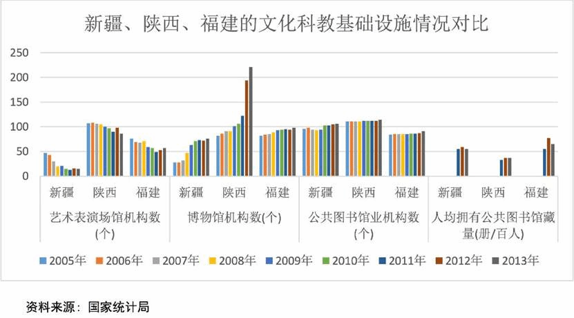 民心相通是“一带一路”建设的社会根基,新疆作为核心区要加紧文化科教基础设施的建设,为今后沿线各国开展文化交流、学习等活动打造良好的文化类基础设施的支持。本文选取艺术表演场馆机构数、博物馆机构数、公共图书馆业机构数以及人均拥有公共图书馆藏量作为衡量文娱科教类基础设施情况的指标,并以海上丝绸之路核心区的福建省和同样地处西北但经济综合竞争力处于中游的陕西省作为对比。从下图可以看出,在各个指标中新疆均落后于陕西和福建。作为文化大省的陕西在各个指标上均处于领先地位,地处东部沿海的福建省在人均拥有公共图书馆藏量方面略有优势,而作为歌舞之乡的新疆却仅有16家艺术表演场馆机构数,这与陕西的86家和福建的57家都有不小的差距。可见新疆的文化基础设施建设仍重而道远。