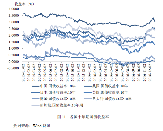 利率方面,在中国经济减速压力依然存在、去产能持续推进、信用债违约风险逐渐凸显等因素影响下,投资者对风险的偏好有所下降,对国债的配置需求增加,国债收益率一路下行,但是在全球相对低利率的背景下,中国十年期国债收益率仍高于美日及欧洲等国家同期限国债收益率(见图11)。尽管经济下行压力增强,中国依旧是增长速度最高的主要经济体,并且考虑到中国较低的通胀水平、稳健的金融机构和稳定的汇率预期,中国债券收益率的吸引力仍然较高。