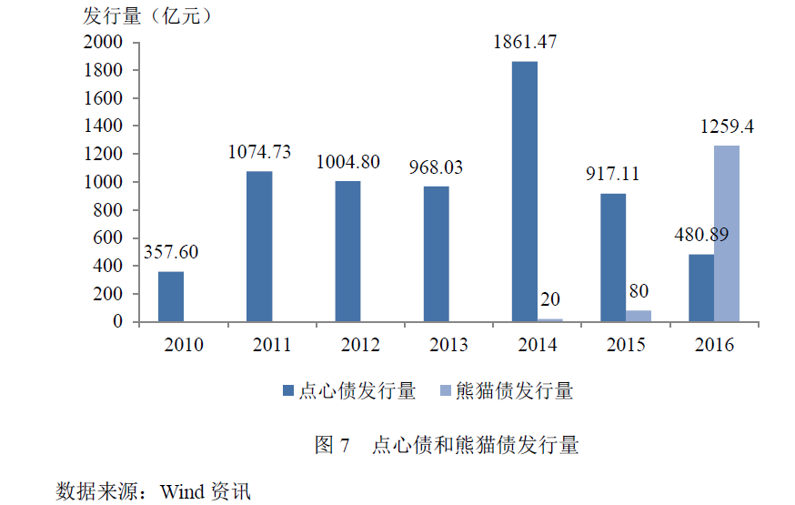 随着相关政策框架的不断完善,中国债券市场开放稳步推进,取得了显著成果。境内债券市场方面,境外机构投资境内债券市场的数量不断增长。截至2016年底,共有411家境外机构在中债登开户交易,同比增长35%。境外机构投资境内债券市场的规模不断上升,截至2016年底,境外机构债券托管量为7642.70亿元,同比增长38%(见图3)。QFIIRQFII投资额度不断增长,截至2016年底,累计批准QFII共计873.10亿美元的境内投资额度,累计批准RQFII共计5284.75亿元的境内投资额度,同比增长8%19%(见图4)。境外机构持有的人民币资产中债券占比不断提升,截至2016年底,境外机构持有人民币资产3.03万亿元,其中债券资产8526.24亿元,占比28.10%,较2015年底上升约8个百分点(见图5),债券成为境外机构持有的第二大人民币资产类型(见图6)。点心债和熊猫债发行此消彼长,2016年,点心债发行量为480.89亿元,同比下降48%。在点心债市场萎缩的同时,熊猫债市场发行量一路攀升。2016年,熊猫债发行量为1259.40亿元,大幅增长约10倍(见图7)。随着中国债券市场的不断发展和开放,境内外债券市场间的壁垒会被逐渐打破,最终呈现二元一体的人民币国际债券市场。