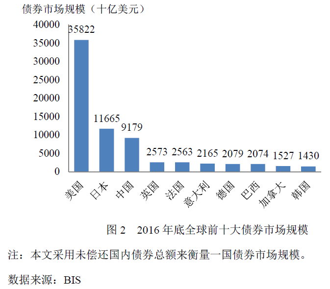 在全球化浪潮下,将平稳有序开放债券市场作为中国资本账户开放的排头兵对中国具有深刻而长远的战略意义,但与其他国家相比,中国资本账户整体开放程度加较低(见图1),而从债券市场开放程度的层面上看,截至2016年底,虽然债券市场规模达9.18万亿美元,是全球第三大债券市场(见图2),但债券市场中境外机构债券托管量占比仅为2.52%,同样还具有较大的开放空间。
