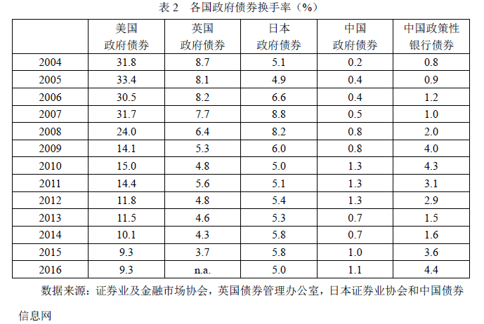 第二,市场的广度和深度有待进一步提升。虽然当前中国债券市场的规模位于世界第三,但并不具备与之相匹配的发达程度。具体来看,首先,相较于其他发达国家,中国债券市场的活跃度有限,流动性不高(见表2);其次,债券市场投资者和债券品种较为单一,不利于形成合理的债券定价机制。截止至2016年底,我国50%以上的债券由商业银行和基金持有,国债和政策性金融债作为主要券种,虽是境外投资机构债券配置的首选,但其持有量明显少于国内商业银行。