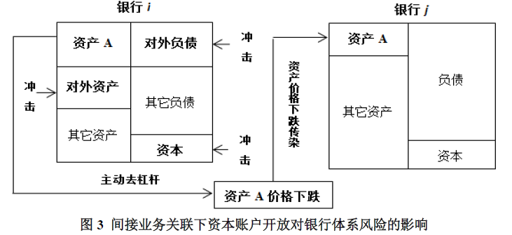 间接业务关联与直接业务关联所示的情景相同,即资本账户开放后会对银行i的对外资产、对外负债以及自有资本造成冲击,比如经济下行期国际资金撤离导致银行持有的资产价格下跌等。冲击造成的银行损失首先由资本金来偿还,偿还后银行i杠杆上升,则银行i可能通过抛售资产降低杠杆。在间接业务关联下,银行抛售的是银行i和银行j共同持有的资产。若银行i卖出的是流动性资产,卖出后不会使资产价格下跌,风险也不会在银行体系内进一步传染。若银行i卖出的是非流动性资产,会通过降价抛售渠道导致资产A价格下跌,从而使持有资产A的银行j遭受损失(方意和郑子文,2016)。