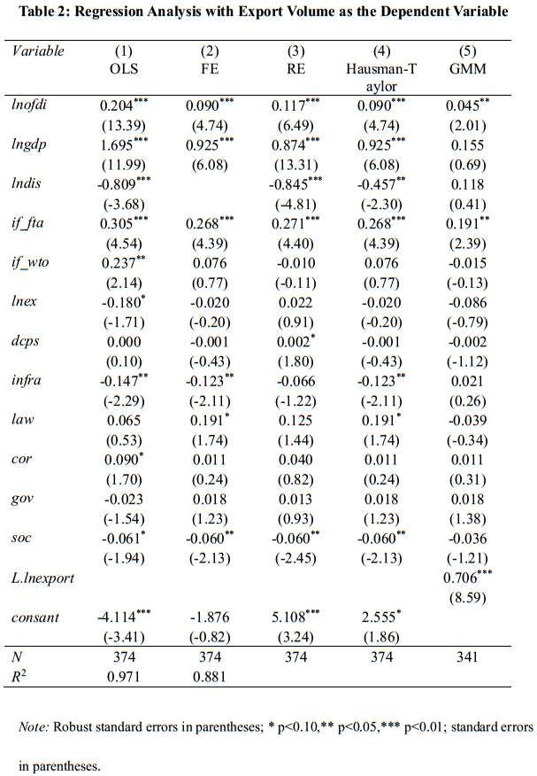 其中第一个扩展的引力模型用于分析中国对一带一路国家的直接投资对贸易深度边际(出口总量)的影响。第二个扩展的引力模型用于分析中国对一带一路国家的直接投资对贸易广度边际(出口产品种类数量)的影响。
