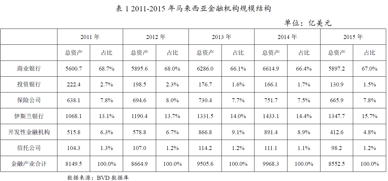 马来西亚金融结构较为完善,金融发展说相对较高。商业银行是主要的金融机构,银行贷款和资本市场都在企业融资中扮演着重要的角色。其金融结构有以下几方面特点:第一,传统金融机构与伊斯兰金融机构并存;第二,集中度高的行业机构与较强的商业银行的主导的特点;第三,较为发达的证券市场及间接融资与直接融资并重的企业外源融资结构;第四,服务于特定对象的开发性金融机构,主要包括服务与农业、中小企业(SME)、基础设施、进出口贸易及高新技术产业的开发性金融机构。