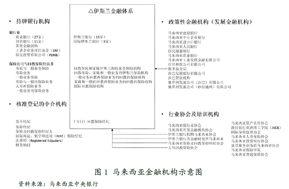 马来西亚现已形成以商业银行为主体,投资银行(证券公司)、保险公司、信托投资公司、政策性金融机构及各种中介机构并存的金融组织体系。根据马来西亚中央银行的分类,马来西亚金融机构划分为持牌银行机构、政策性金融机构、核准登记中介机构、行业协会及培训机构四大类(见图1)。由于马来西亚国教为伊斯兰教,其各种金融机构中又包含伊斯兰金融体系,形成了独特的传统金融与伊斯兰金融共存的“二元金融结构”。