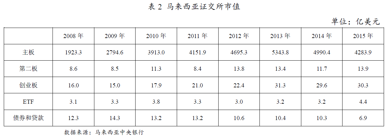 在金融市场结构中,马来西亚货币市场和资本市场发展迅速。现已形成了以政府证券为主导,流通存款票据、银行承兑汇票等多种交易工具并存的货币市场。货币市场交易价格也逐渐稳定,波动较小。而从资本市场角度来看,吉隆坡股票交易所现已成为亚洲最大的证券交易所之一,提供超过800家上市公司的各种投资选择。同时也建立了较为完善的多层次资本市场,但二板市场和创业板市场融资规模很小,仍有较大的发展空间。
