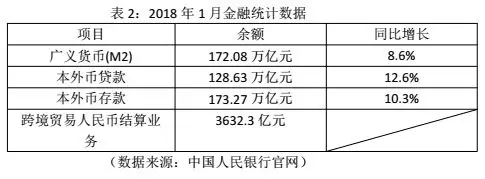 2. 2018年2月12日,中国人民银行公布2018年1月金融统计数据报告。主要数据如表2所示。