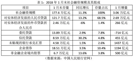 1. 2018年2月12日,中国人民银行公布了2018年1月末的社会融资规模统计数据报告。其中,2018年1月末社会融资规模存量为177.6万亿元,同比增长11.3%。2018年1月份社会融资规模增量为3.06万亿元,比上年同期少6367亿元。具体组成数据如表1所示。