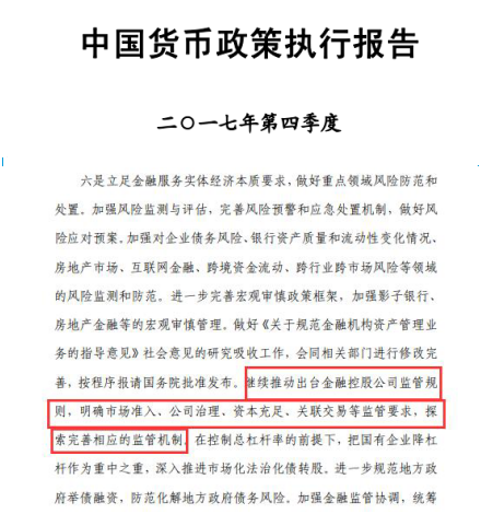 央行日前发布《2017年第四季度货币政策执行报告》中提出,继续推动出台金融控股公司监管规则,明确市场准入、公司治理、资本充足、关联交易等监管要求,探索完善相应的监管机制。