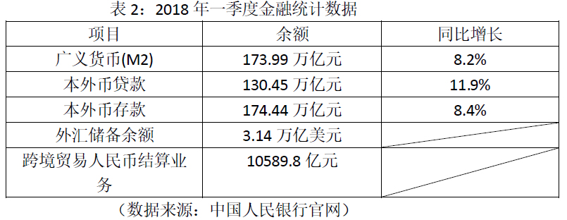 2. 2018年4月13日,中国人民银行发布了2018年一季度的金融统计数据,具体如表2所示。