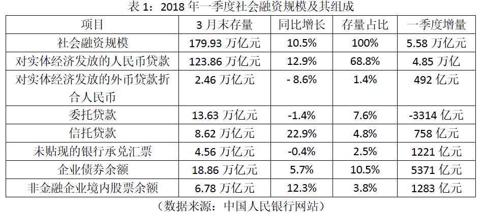 1. 2018年4月13日,中国人民银行发布2018年一季度的社会融资规模数据,具体如表1所示。