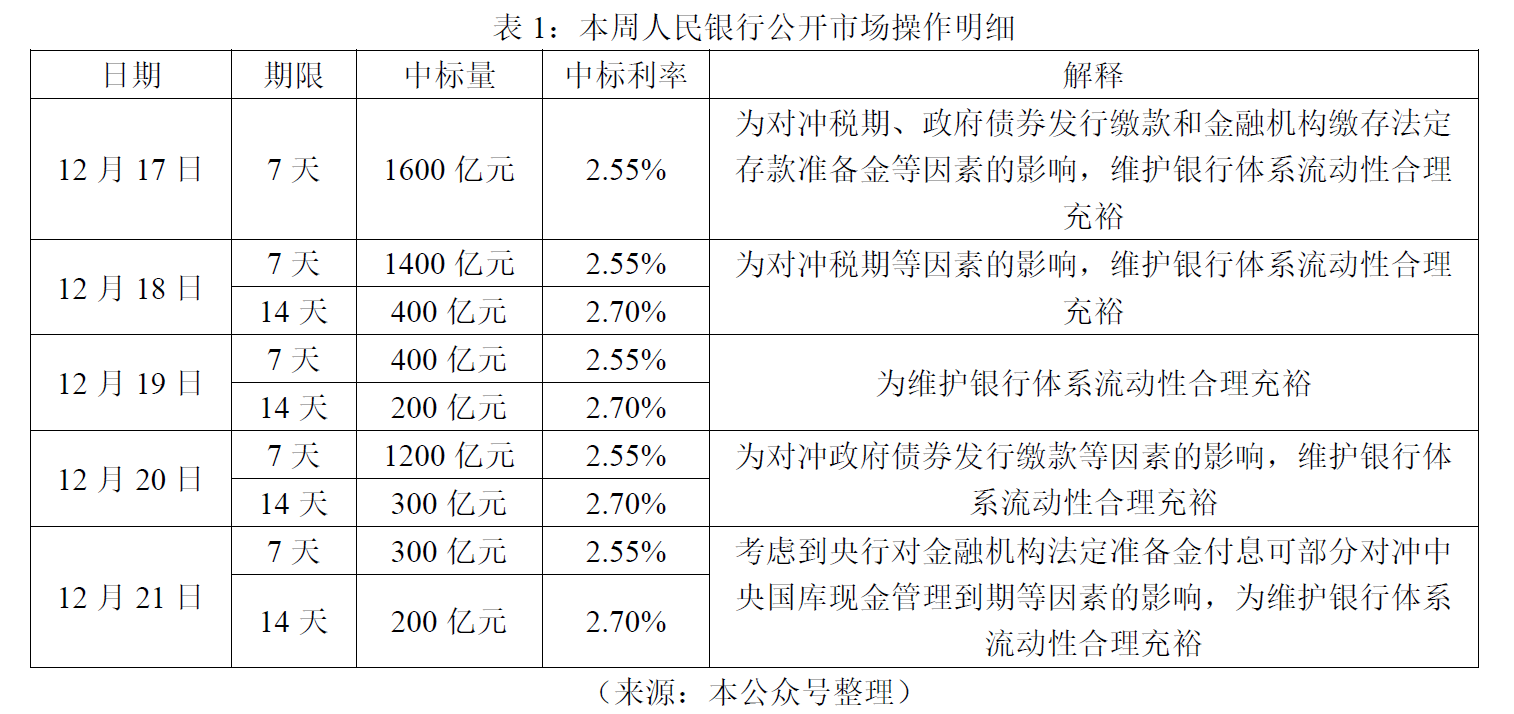 表1:本周人民银行公开市场操作明细