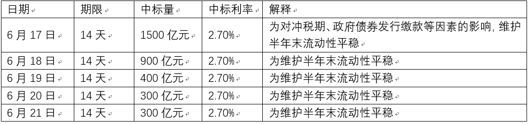 编者按:为维护半年末流动性平稳,本周人民银行开启了大规模逆回购操作,向市场注入流动性。同时,人民银行对本周到期的2000亿元中期借贷便利(MLF)等量续做的基础上,对中小银行开展2400亿元的增量操作。这体现了人民银行货币政策逆周期调节的思路。