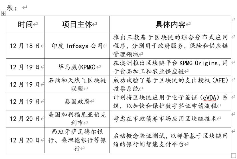 近两周来,全球范围内涉及区块链技术的研发及应用活动较为活跃,且梳理发现,这些项目主体较为分散,既包括政府部门、跨国联盟,也包括银行、会计师事务所等各类机构,而具体的应用领域则囊括政府政务、金融、供应链、投票等。具体项目见下