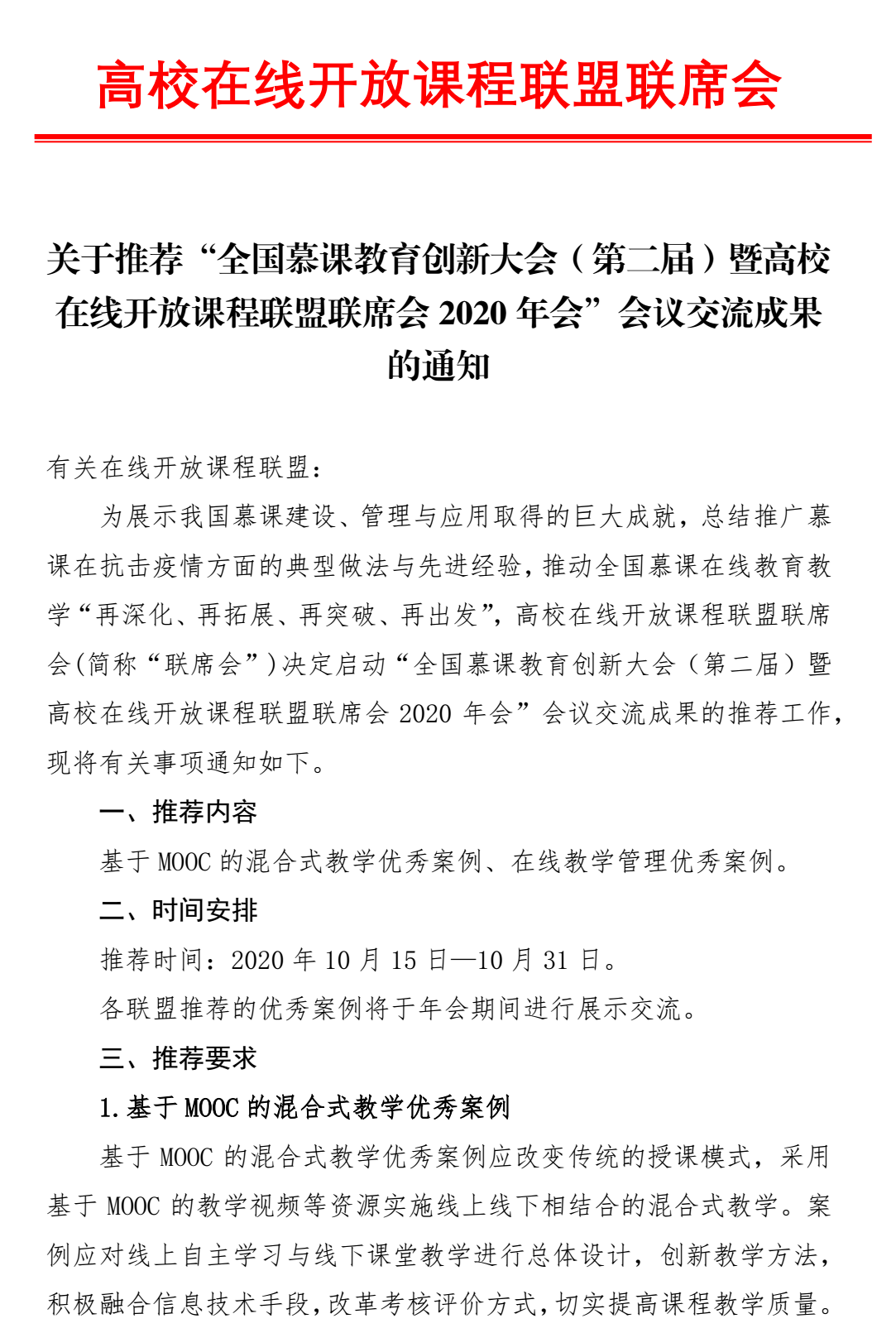 关于推荐“全国慕课教育创新大会(第二届)暨高校在线开放课程联盟联席会2020年会”会议交流成果的通知