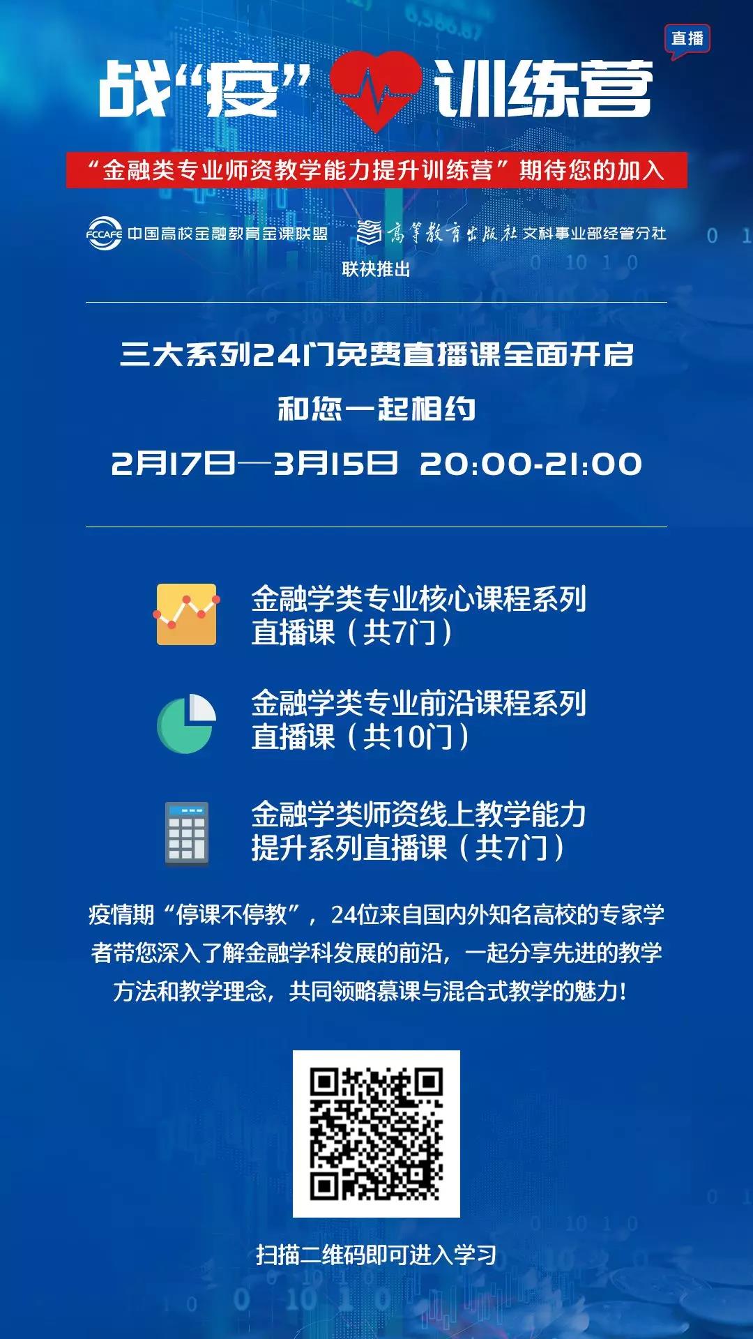 "金融类专业团队教学能力提升训练营"即将开启!2月17日—3月15日,每天20:00—21:00。共分三期24门免费直播课具体日程安排如下: