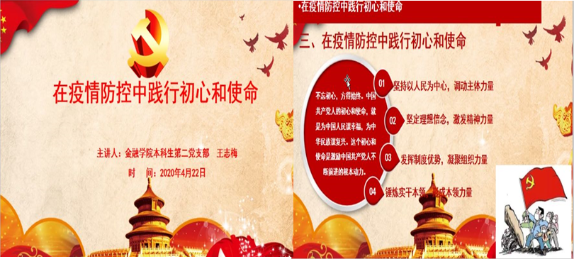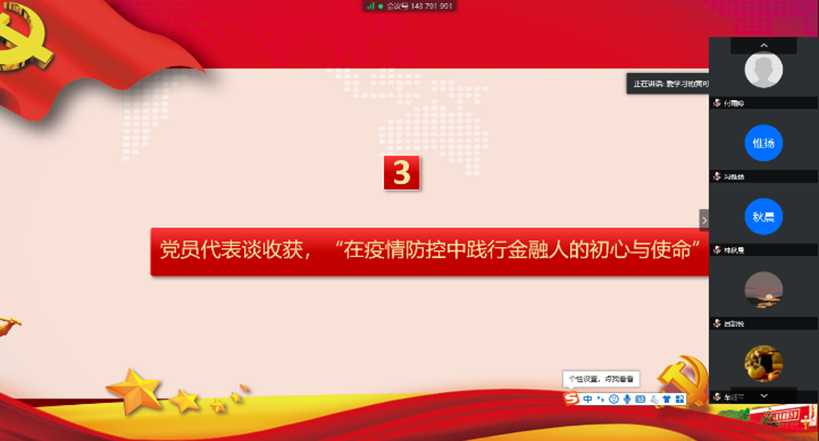 最后,支部书记王志梅老师开展“在疫情防控中时间初心和使命”的云党课。王志梅老师从紧紧依靠人民群众坚决打赢疫情防控阻击战、金融和科技助力打赢疫情防控阻击战、在疫情防控中践行初心和使命三个方面,分析了当前我国疫情防控向好态势进一步巩固体现了以人民为中心的发展思想和中国特色社会主义制度的组织优势;在疫情防控中,中国人民银行等五部委的联合发文吹响中国金融业抗疫集结号,基因测序、人工智能、5G等科技手段在抗疫中的运用彰显出科技抗疫的中国力量。她指出,在防控疫情的“大考”中,只有坚守党的初心使命并将其贯穿于调动主体力量、激发精神力量、发挥组织力量、形成本领力量的各个方面,才能赢得这场战役的最后胜利。她希望同学们以疫情防控作为守初心担使命的主战场,以实际行动感召同学们支持疫情防控工作、自觉投身疫情防控、积极担当作为,用实际行动在疫情防控中践行初心使命。