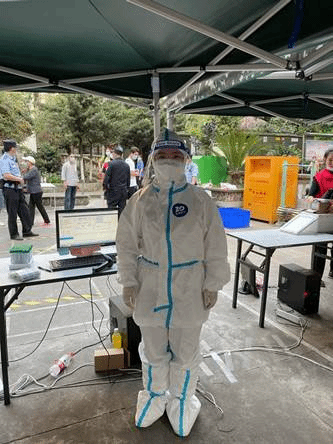 第二天,天还没亮,老爸就送我到达此次的志愿服务地点小西门社区。当工作人员进行工作分配时,介绍道:“信息录入需要4名志愿者和4名工作人员,2人一组搭配着,要用到电脑……”我想正好能发挥所长,于是踊跃提出参与此项工作。此外,还有维持秩序等岗位的志愿者。随后,我们又被告知,信息录入岗位的志愿者和工作人员们都需要穿防护服。能成为“大白”让我既兴奋又紧张,同时也给我带来了一些不便,如不能上厕所和喝水,但是这些不便都被我一一克服,忍一忍也就过去了。穿、脱防护服都有规定的顺序,同时在整个过程中注意消杀,多次使用酒精消毒。