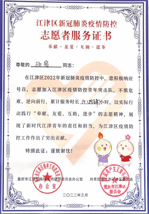 2022年3月17日下午,我偶然看到“江津融媒”公众号上发布的疫情防控志愿者的招募通知,作为BETVICTOR的一名老员工党员,为人民服务的宗旨和热爱家乡的强烈意愿促使我立马报了名,并且符合相应的报名条件,家长们也很支持。之前2020年也在社区担任抗疫志愿者的老爸还鼓励我好好干。
