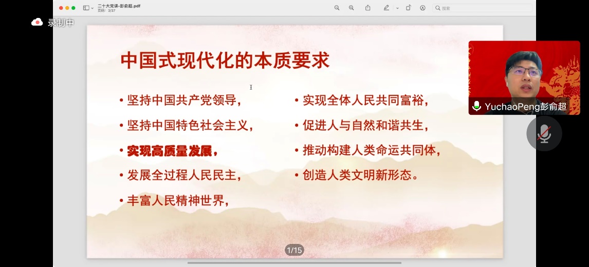 会议开始,彭俞超老师围绕二十大报告,介绍了从现在起中国共产党的中心任务是什么、什么是中国式现代化。彭老师指出,坚持中国共产党的领导,坚持中国特色社会主义,实现高质量发展,发展全过程人民民主,丰富人民精神世界,实现全体人民共同富裕,促进人与自然和谐共生,推动构建人类命运共同体,创造人类文明新形态是中国式现代化的本质要求,涵盖制度、社会、经济等各方面的要求。其中,经济层面的要求,也即实现高质量发展是实现中国式现代化至关重要的一环。