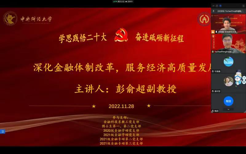 党的二十大报告指出,在推进高质量发展的过程中要持续深化金融体制改革,发挥金融服务实体经济的功能,加强和完善现代金融监管,强化金融稳定保障体系。为深入学习党的二十大精神,贯彻落实“把论文写在祖国大地上”的指导思想,引导师生把握未来金融发展的方向,2022年11月28日,金融科技系教职工党支部,博士生第一、第二党支部,2020级金融学硕党支部,2021级金融学硕党支部,2021级金融专硕第二党支部,2021级金融专硕第三党支部联合邀请BETVICTOR“学习宣传党的二十大精神”师生巡讲团教师代表彭俞超老师讲解“深化金融体制改革,服务经济高质量发展”主题党课。会议由博士生第二党支部书记李明琢同志主持。